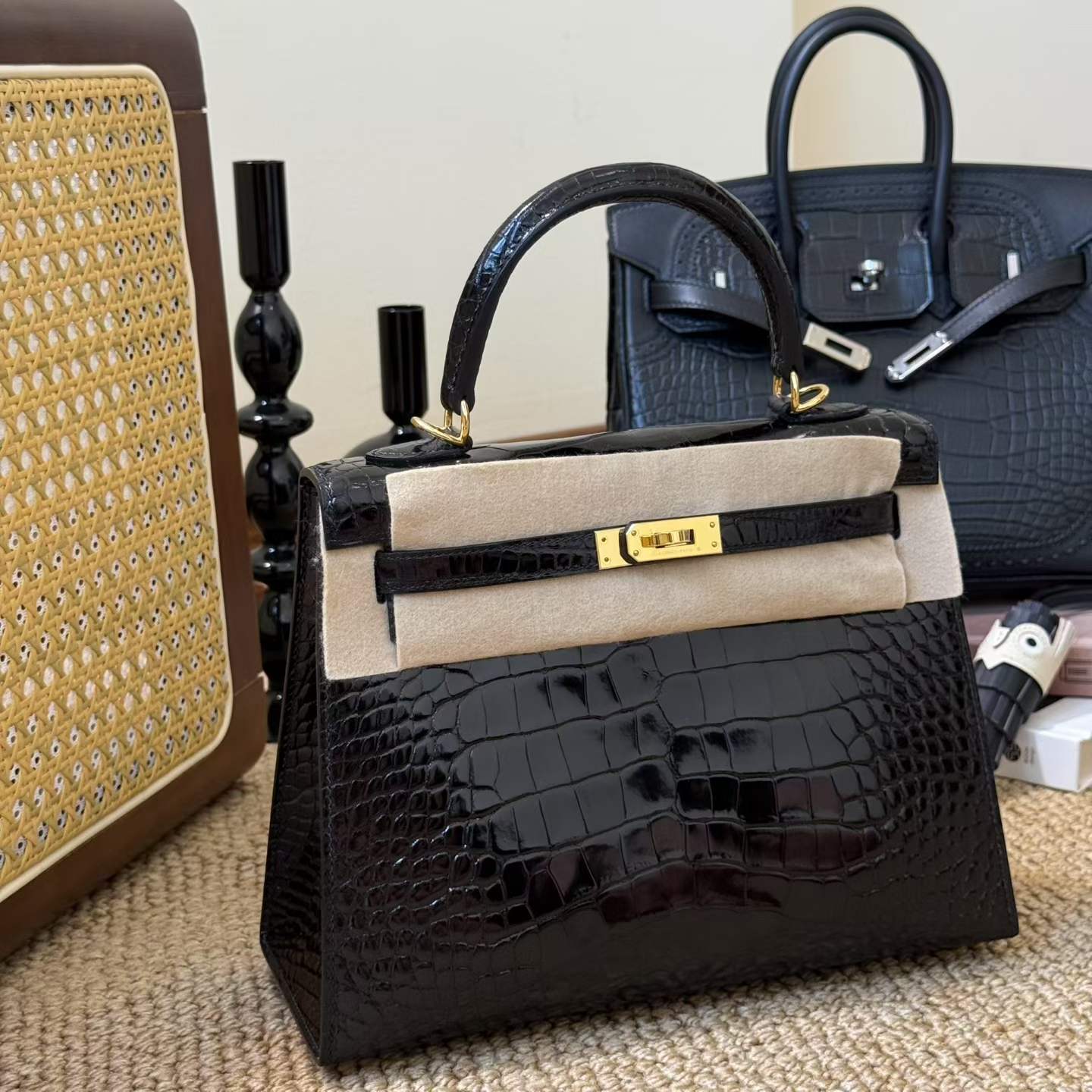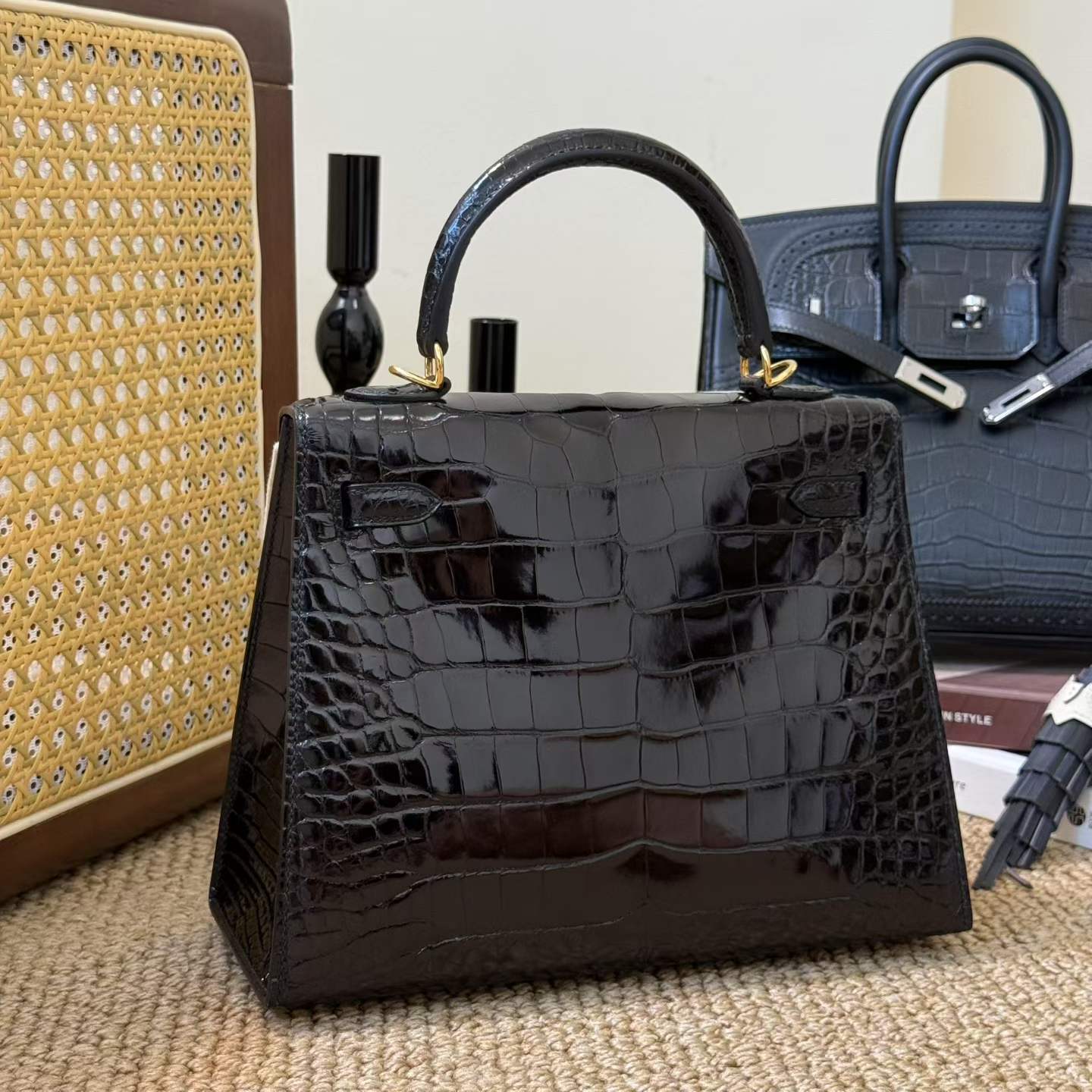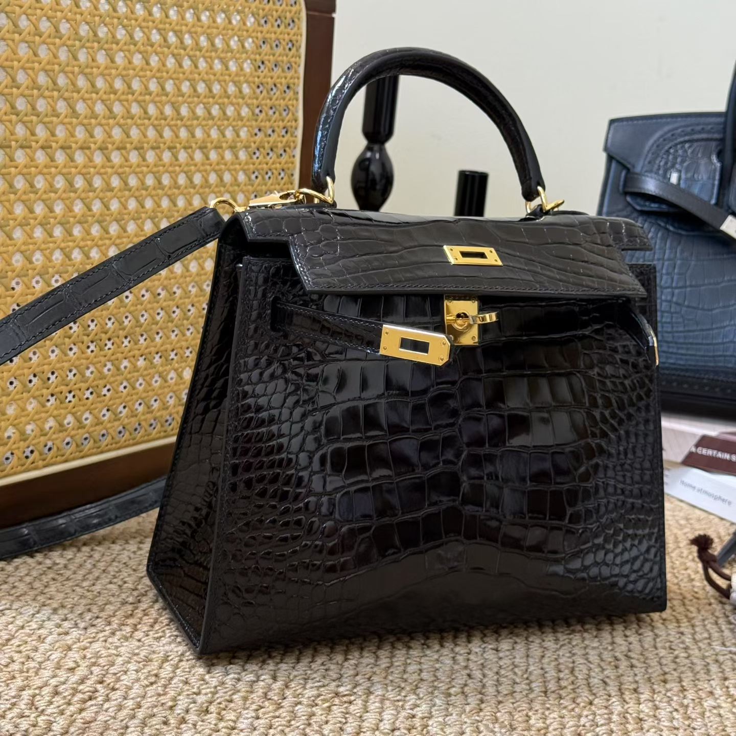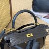 Hermès Kelly 25 Black Shiny Crocodile Gold Hardware